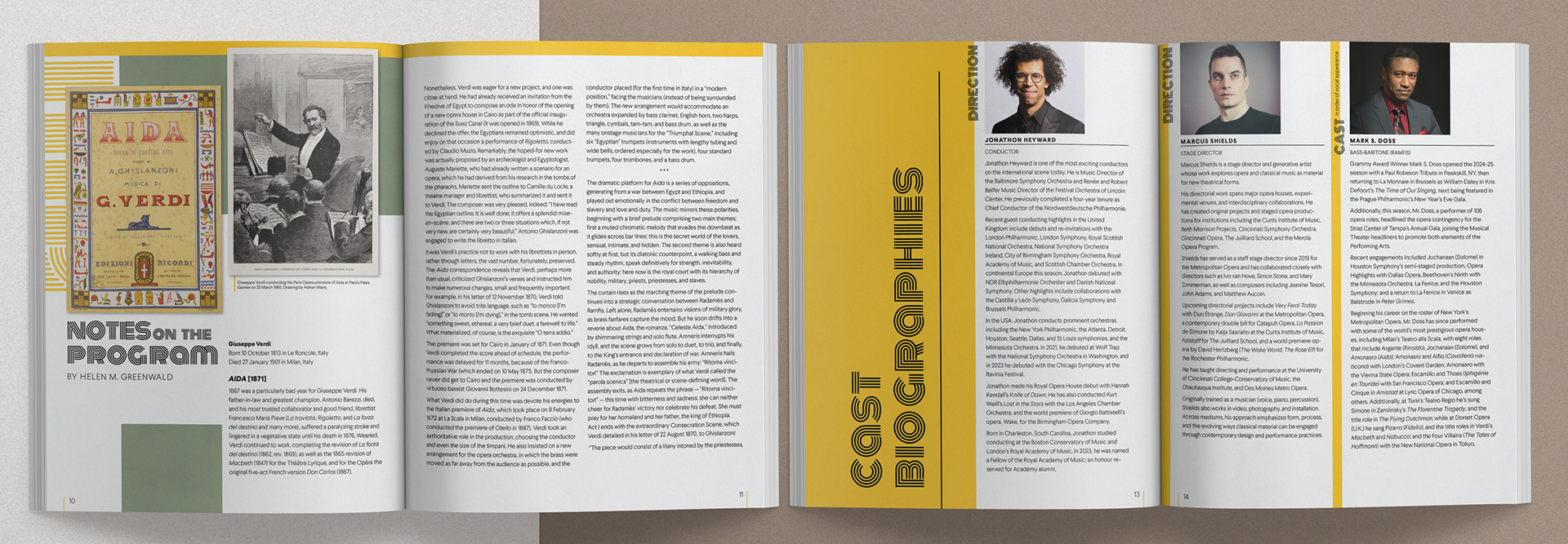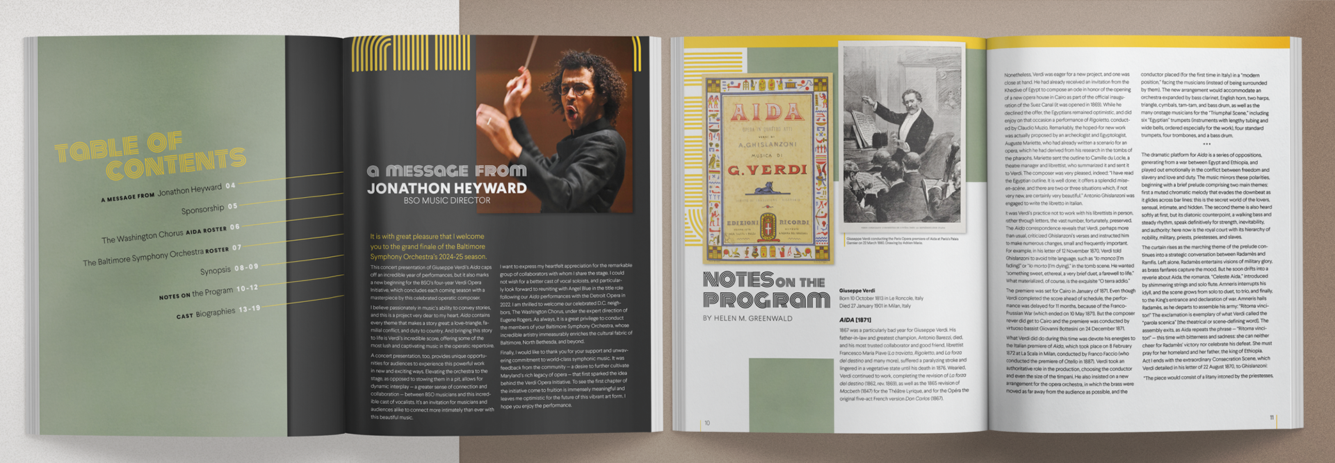 I designed a 16-page concert program for the Baltimore Symphony Orchestra's performance of Verdi's Aida, featuring program notes, cast biographies, and performance information. This production is part of a multi-concert Verdi series led by Music Director Jonathon Heyward. I created a unified visual identity across the key art, print materials, and advertising for all the operas in the series. Each individual design stands alone while complementing the others, so that by the series' end, the collection of programs and materials forms a cohesive set.