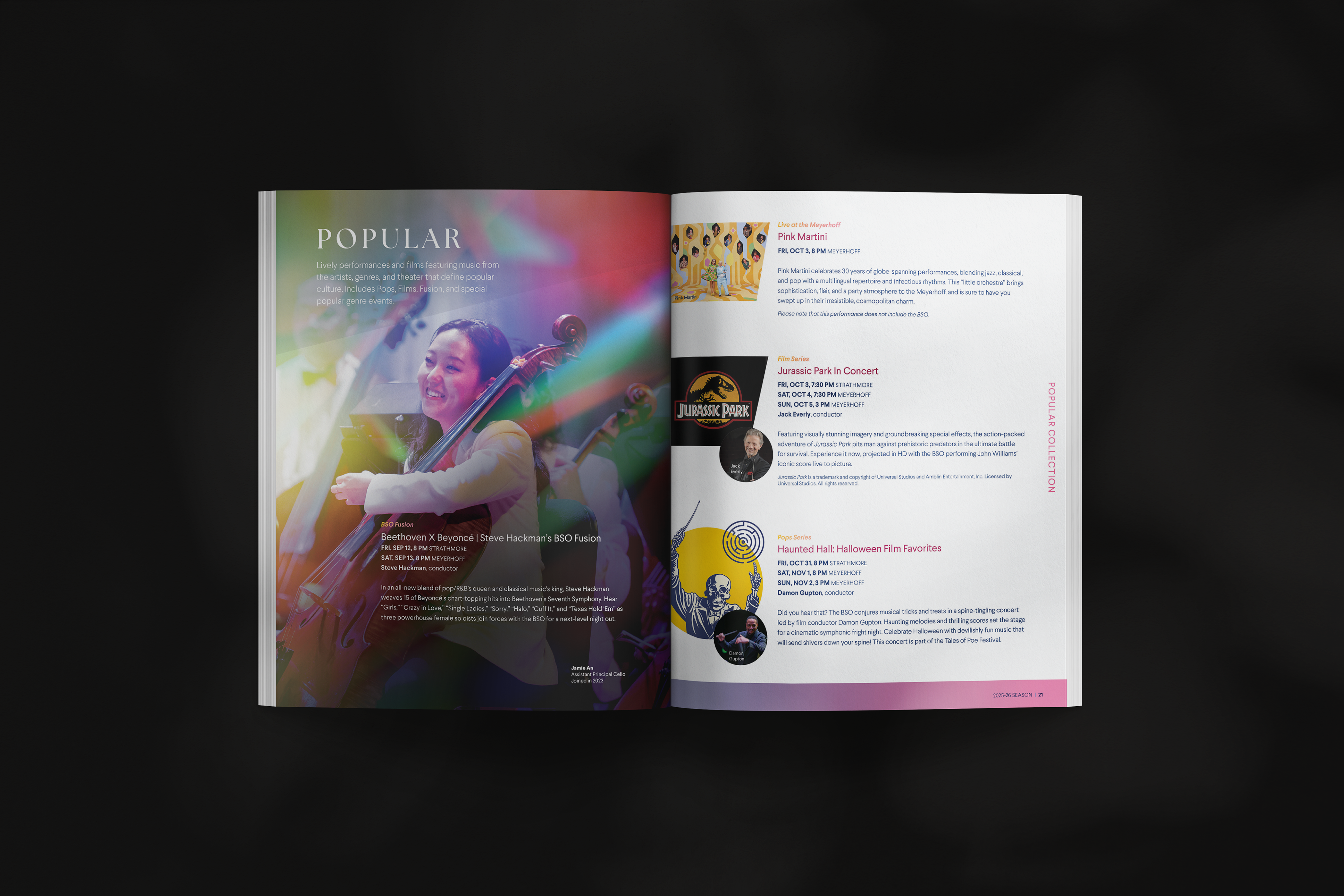 A 40 page catalog containing all information and concert programming for the 2025-26 Season. This brochure acts as the design catalyst for the season -- various signage, social campaigns, and marketing materials are based upon the aesthetic themes developed in this brochure